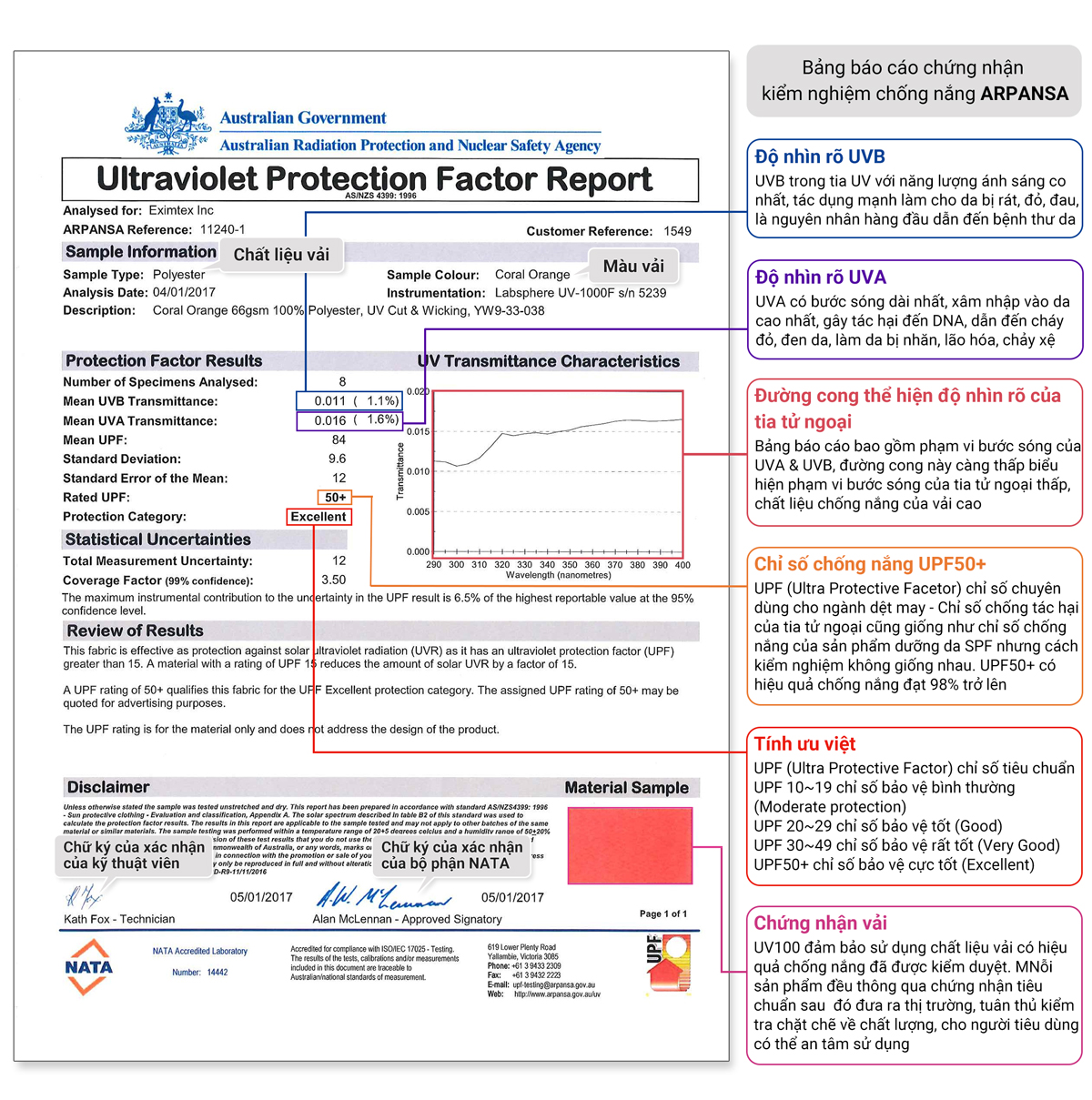 Mỗi loại vải, màu sắc cho từng sản phẩm của UV100 đều được ARPANSA kiểm nghiệm tại Úc và cấp báo cáo chứng nhận chống nắng.