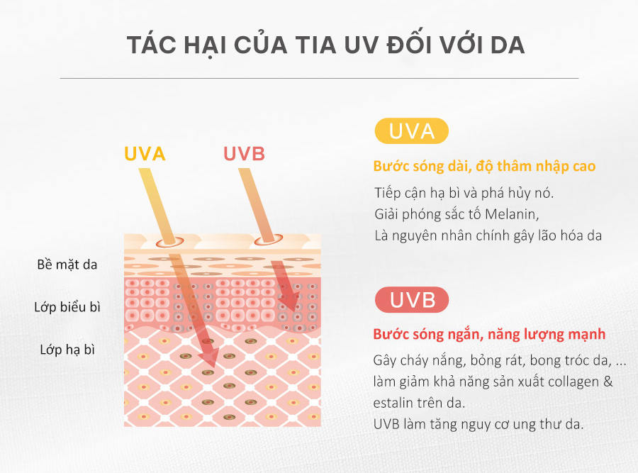 Tia UV có thể được chia thành tia cực tím UVA, UVB, UVC.