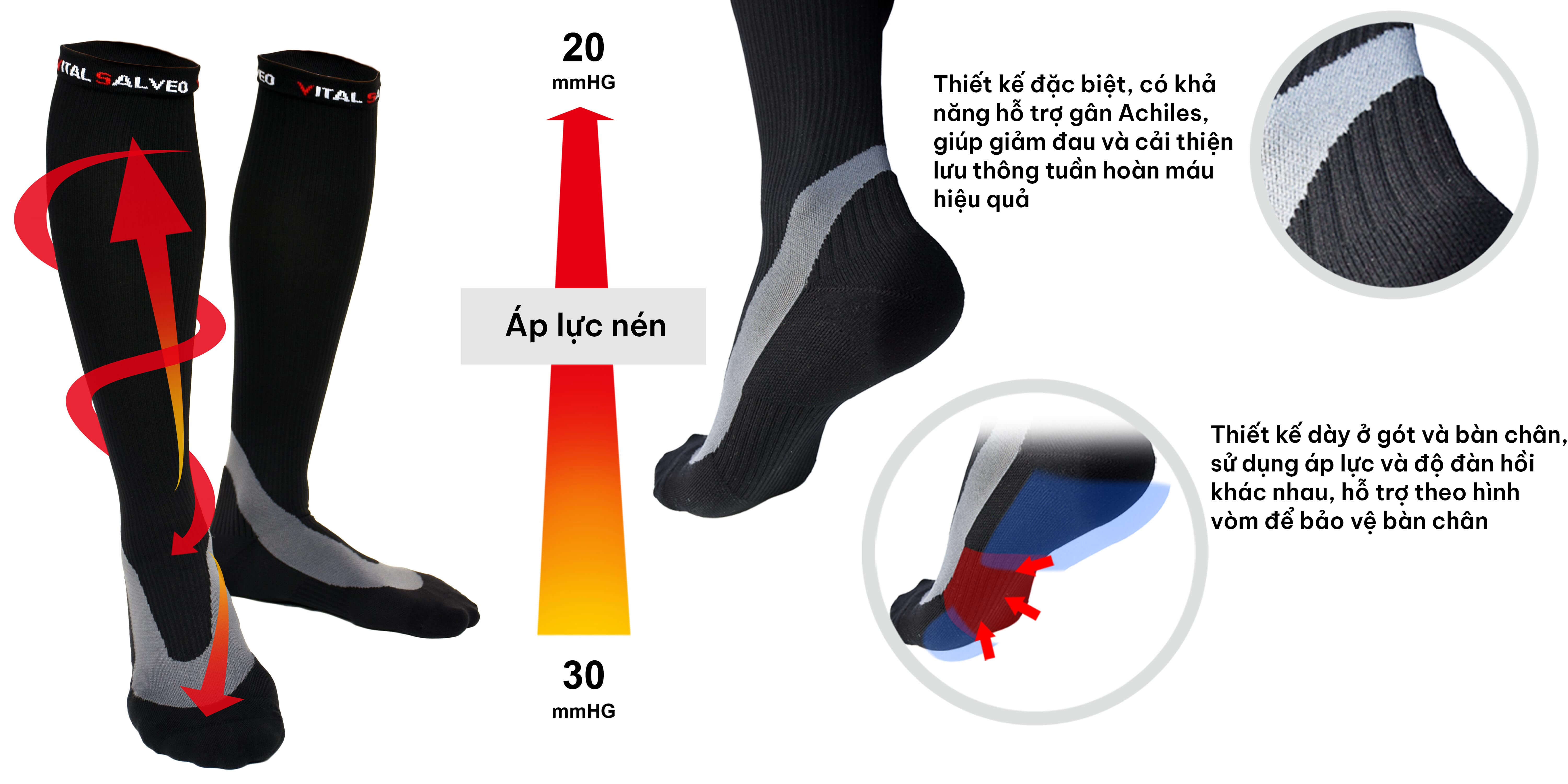 Ứng dụng công nghệ nén dần độc đáo với cổ chân không siết, tạo áp lực cao hơn ở phần bắp chân và giảm dần xuống ở phần gót chân, giúp máu dễ dàng trở về tim và cải thiện lưu thông tuần hoàn máu chung của cơ thể.